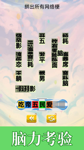 1、进入关卡会看到很多的文字,这些文字其实就是近期在抖音上比较火的梗,我们只需要将梗组合起来即可通关;