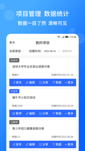 4、PC端创建的问卷,移动端也能随时查看统计数据、暂停收集等操作。