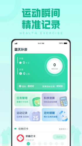 蓝天计步是一款健康计步工具类软件,可以帮您精准计算步数、管理运动数据和完成任务打卡。