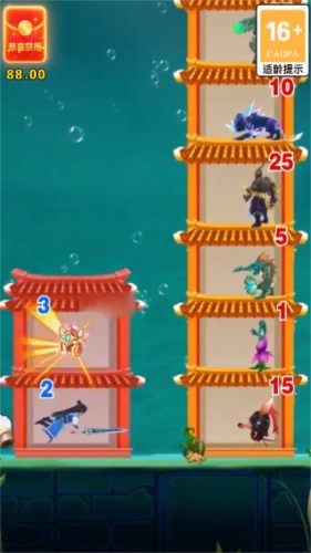 1、一直爬塔则一直有红包拿,在战斗中领略绝技,不断增强自己的属性,变得更强。