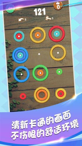 将3个颜色相同的圆环排列成一条直线或一个完整的堆栈时,它们将消除并得分。