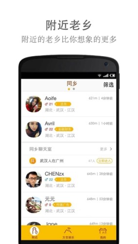 【附近老乡】一键查找在您身边的老乡,一起聊天。筛选职业、年龄、性别,找到同城、同行的老乡,还能找到某个指定行业的老乡帮忙。