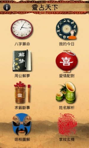 灵占天下是一款简洁易用,极具中国风的占卜应用,是在安卓平台上最受用户欢迎的占卜算命应用之一,它以中国五千年来所传承的周易人文思想告诉您命理变化的秘密,为您晓通命运,决断未来之事起重要帮助。