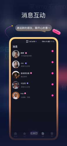 这里有丰富房线上互动和聊天室玩法,融合文字、声音及图片的全方位互动社区,在EMO可以随时随地找到你心水的声音,遇见懂你的人.