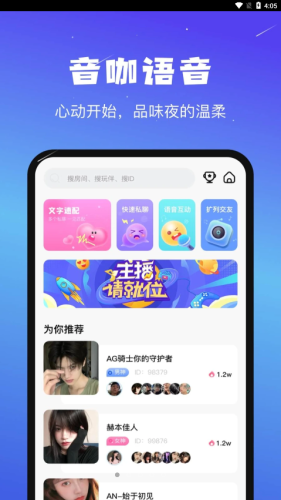 音咖语音app,语音连麦交友平台,认识更多有趣对象,随时随地在线聊天,分享个人精彩生活,发现喜欢的声音,语音聊天交友更简单、更轻松。