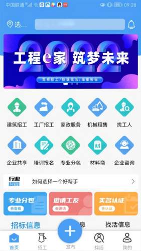 工程e家是企业共享、工程专业分包、工程劳务分包、机械租售、材料商供应、建筑招工、制造业工厂等各行业构建一个高效、便捷的招工找活信息大平台。致力于为建筑工人提供真实可靠的招工找活信息、工程劳务项目推荐、各类建筑资质代办、工程管理员及技术工培训报名的一站式等服务。系统的解决了工地项目管理过程中所面临的用工、材料、设备等问题,用移动互联网的力量将建筑行业、项目管理人员、施工班组与工人多效连接,最终实现建筑项目高效管理。
