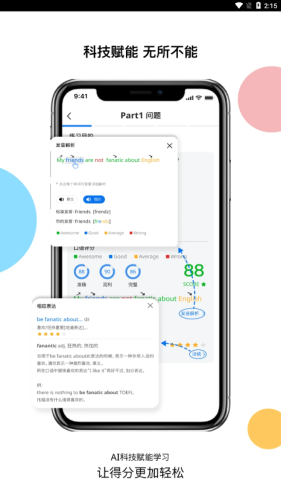 内置专业雅思评测模块:语音语调智能识别,精细纠音;实时准确反馈,精准缩短口语学习反馈路径;全面评测,每一个雅思口语的方面都涉及。