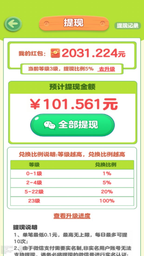 初始提现比例高达2%(比常见的多了一倍),简单玩一下,拿个新人红包,然后就可以去先提0.3看看到不到帐。