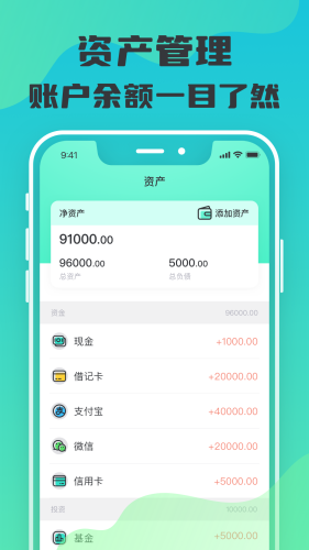 资产账户:支持添加微信、支付宝、银行卡、理财账户等账本