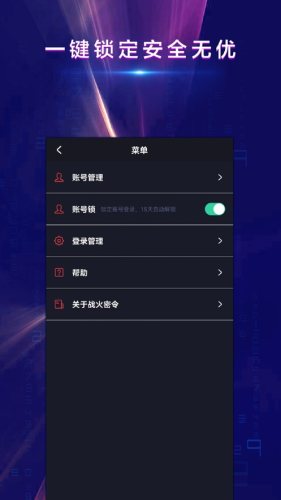 战火密令app是一款游戏账号安全工具,软件拥有登录保护,一键锁号,扫码登录等等丰富功能,可以帮助用户更好的保护战火互娱账号安全,需要的朋友欢迎前来下载使用。