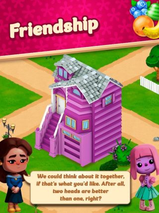 这款游戏中的背景是卡通版的小镇,里面的色彩搭配非常的鲜艳,这里面的人物都设计的非常的可爱,玩家还可以跟这些人物进行互动,在这款游戏中不止可以进行消除的模式,还可以建造各种霸气的建筑物,在这里面有许多未被建造的土地都可以进行建造。