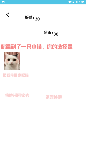 1、收养一只可怜的流浪猫,通过各种互动增添与猫猫的好感度。