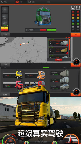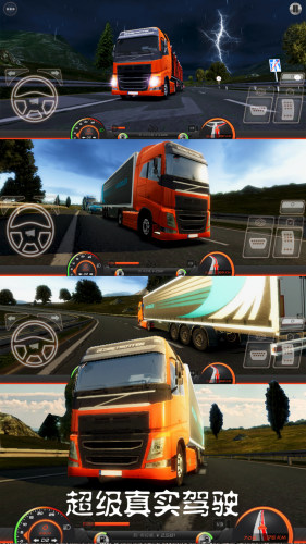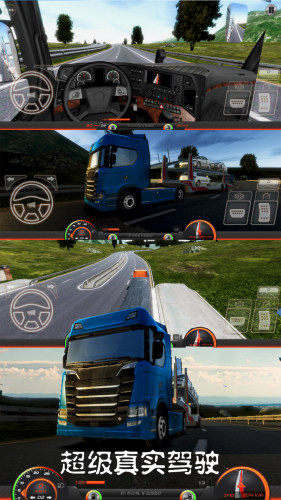 本游戏为卡车模拟经营类游戏,采用超级逼真的天气系统, 超级逼真的卡车引擎,让玩家体验真实的卡车驾驶乐趣。在游戏中,玩家需要将贵重的货物从欧洲十几个国家的中的一个城市,完好无缺的送达到目的地,这将极限考验玩家的耐力,技巧和速度。玩家需要遵守交通规则,尽量避免碰撞,否则将会有一定的罚款。经过不断的积累财富,玩家可以够买更好的卡车,和拖车,可以探索更多不同的线路,逐渐成长为卡车界的精英,王者。