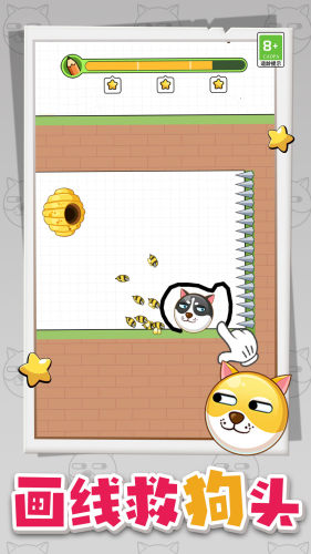 通关方法:画一个半圆形的圈,将狗狗圈在里面,这样蜜蜂就蛰不到狗狗了。