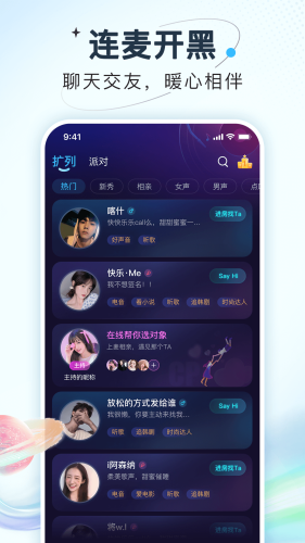 嗨嗨星球-交朋友,从Hi开始。是一款集语音聊天、连麦交友、声音交流、速配扩列为一体的语音互动交友app,爱聊天可创建扩列交友语音房间,一键拥有你的线上圈子!抛开生活的烦恼和压力,通过声音结识更多有趣的灵魂,陌生交友,匿名聊天,语音聊天,成为你好用的聊天助手。