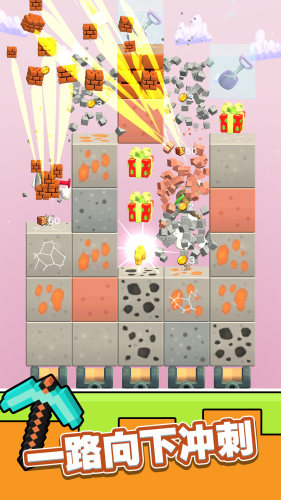 根据情景,将铁铲移到石头,冰块比较少的位置,开始掉落,敲碎障碍物,开启宝箱,获得奖励!点击礼盒可以开出不同等级的铁铲,同等级的铁铲可以合并升级,更快,更有效的敲碎障碍物!