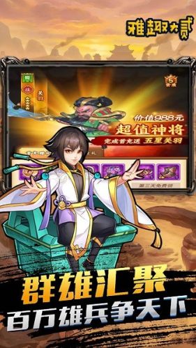 《雅趣大贰》是一款三国题材卡牌手游,获取无限元宝。精彩绝伦的战斗模式,热血沸腾的万人国战,让人欲罢不能!群雄兵戎战场见,万人攻城美名留!承袭三国辉煌,成就王者雄风!携名将一统天下,就待你我!