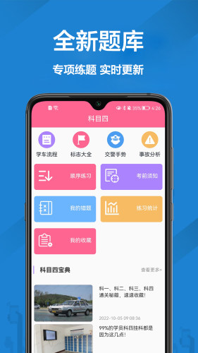 1.实时新题库:2022学车新题库,涵盖小车、客车、货车、资格证等驾驶证类型,试题及时更新,准紧跟驾照科一科四考点;