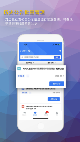 对历史已发公告公示信息进行管理查阅,可在线申请删除问题公告公示