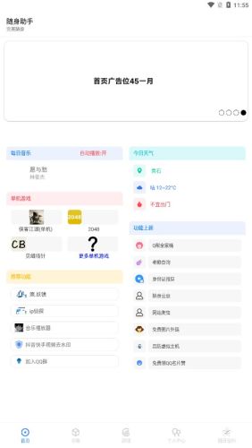 随身助手app,拥有大量常用工具,全面覆盖生活、娱乐、学习等方面内容,工具齐全,轻松看天气,免费听歌,畅玩各种游戏,多种工具免费用。