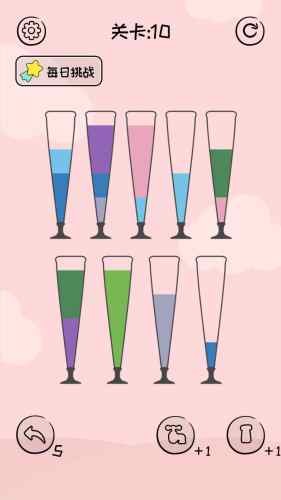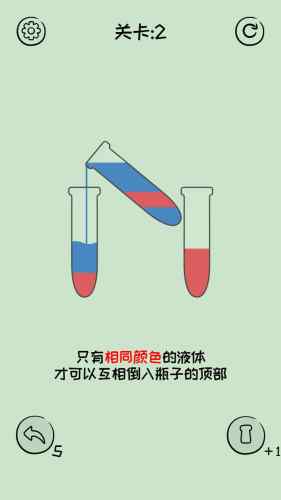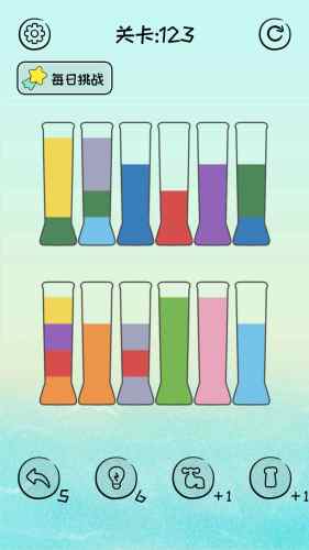 2、思考正确的操作顺序,将所有液体按照颜色分类后即可通关。