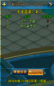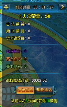 1. 玩家进入三界争霸战场后,随机分配到一个阵营,击杀或者帮助本阵营玩家击杀敌对阵营玩家,可增加个人荣誉和阵营积分。