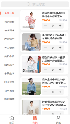 1、分类:分类包含搜索,全部分类,日用百货,养生健康等