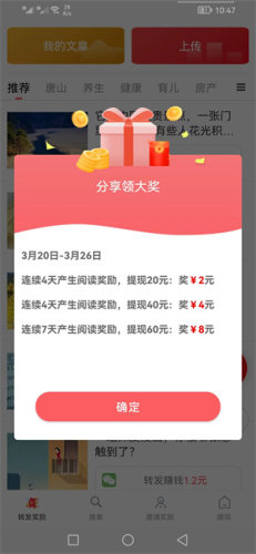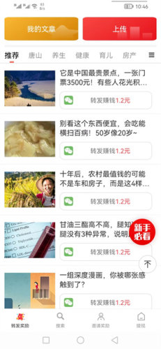 1、点击星空赚app右下角的“文章”或者视频样式图标打开文章列表,选择喜欢的文章并打开,点击右下角“立即分享赚钱”按钮