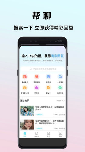 帮聊app下载,一款汇聚海量恋爱聊天话术的好帮手,通过帮聊app学习各类聊天话术,超多土味情话一键复制,分类指导更加实用,有需要就来下载。