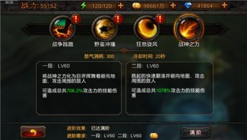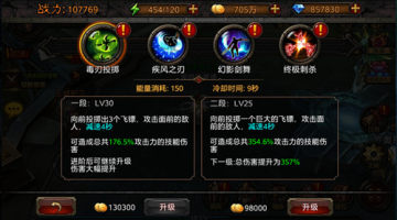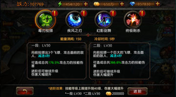 通过主城界面的“技能”按钮进入技能界面,玩家在达到一定等级并完成相应的主线任务,即可解锁对应职业的技能系统,之后角色达到对应等级则可以学习新的职业技能,角色升级后可以通过消耗金币来升级技能等级,从而提升角色的实力,游戏三大职业每个技能都分为第一段和第二段两部分。