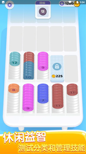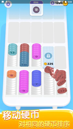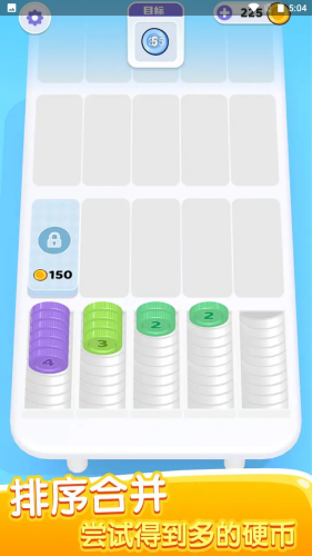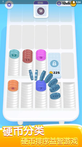 硬币分类小游戏比较的简单,其实算是汉诺塔的玩法方式,玩家需要将屏幕上的硬币进行分类和合并,游戏目标是将所有的硬币分类归纳,并将相同种类的硬币放在一起,从而挑战更高的分数。