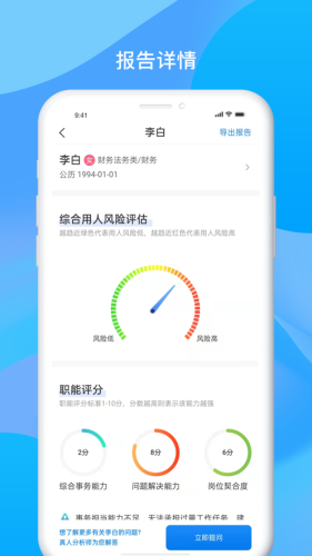 1.【职能评估】根据用户提交的人员信息进行智能评估,分析对象在不同职业中的优劣势等信息,最终得出用人建议报告;