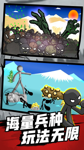 火柴人战争之巅,经典火柴人战争策略模拟游戏,玩家加入火柴人战争世界,召集弓箭手,战士等兵种,搭配打造强大阵容,搜集资源挖掘黄金,布阵征服整个领土。