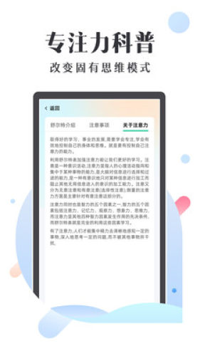 3、拥有最新的记忆力和专注力训练技术和方法,为用户提供更加科学的训练模式和方式。