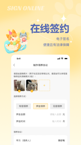 领养代替购买,领养步骤由平台层层把关,签署领养协议由区块链等技术完成智能审阅,实时存证,保障电子签名等数据真实有效,法律保障性更高,猫狗贩子望而却步!