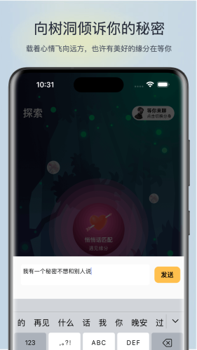 树洞漂流瓶app下载,一款轻松易用的陌生人匿名社交平台,通过树洞漂流瓶app可以随时对树洞倾诉秘密,或是倾听匿名故事,温暖互动,有需要就来下载。