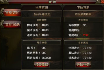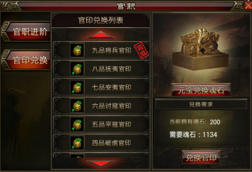 3、 升级不同的官职后,可以用魂石兑换不同等级的官印,官印会影响玩家的属性,官印等级越高,给予玩家的属性加成就越好。