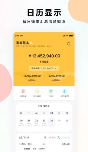- 日历显示:日历形式记录每日账单汇总,清楚知道花多花少