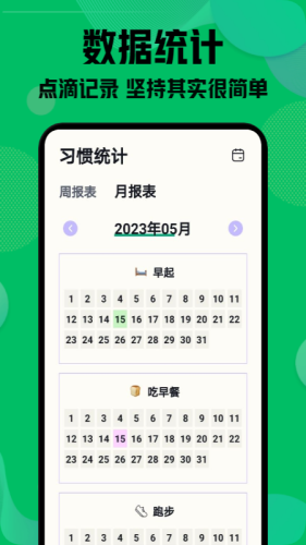 3、多维度习惯数据呈现,快速了解每个目标坚持的天数及完成情况,见证每天进步,收获满满成就。