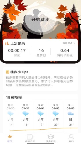 1、徒步记录:记录您的徒步时间和里程,帮助您轻松掌握健康运动量;
