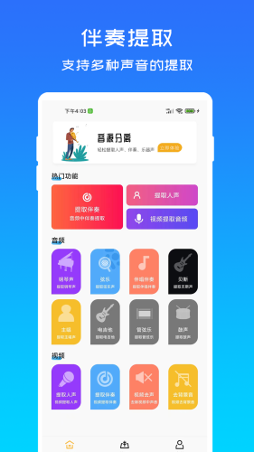 音源分离是一款能够提取音频文件的手机实用工具。软件内置多种音频伴奏提取功能模式,带来独特视频去声以及视频背景音乐去除方式。用户可以直接将多种使用进行分类提取,随时可以把提取音频文件进行保存管理。