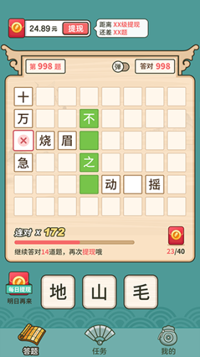 成语梦长安红包版不仅提供了娱乐和挑战,还可以赚取现金红包奖励。这是一个以古代长安城为背景的猜成语游戏,玩家需要通过猜测成语的拼音和解释,探索长安城的故事和文化内涵,并解锁关卡来达到通关目标。