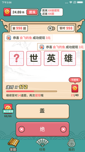 3、探索长安城:每个关卡都与长安城的故事和文化有关。玩家在猜成语的过程中,可以了解长安城的历史背景、名胜古迹,感受古代文化的魅力。