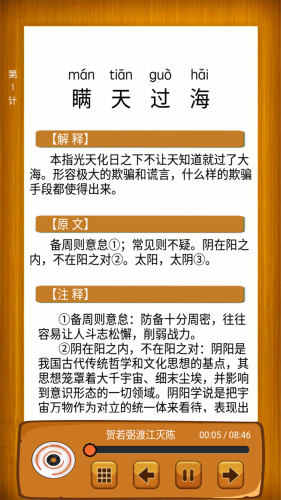 听故事学三十六计是通过听故事学习中华传统文化的学习软件,包含了三十六计和二十四孝的有声故事全集。软件以家喻户晓的故事作为收听的主要内容,让孩子在趣味听书过程中汲取知识,了解文化内涵。