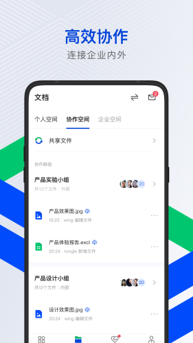 2、高效协作的群组空间:自由地发起协作空间,随时随地跨公司、部门进行文件共享与协作;