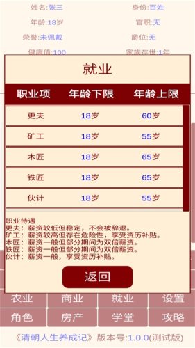 以清朝时期为参照题材,模拟、经营、养成为玩法的单机文字类游戏,本游戏包含家族系统、官职系统、职业系统、农业系统、商业系统等玩法,你可在此创造属于你的精彩人生!