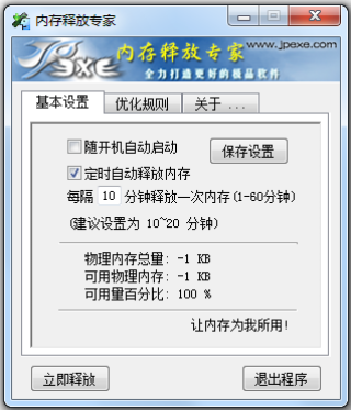 开启软件后,点击窗口左下方的立即释放按钮即可完成内存释放工作,本工具支持定时操作和随开机自动启动。