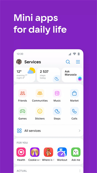 VKontakte 通过提供无限的通信、娱乐、商业和分享来自世界各地的新闻的功能,将数以千万计的人团结在一起。在应用程序上,您可以听音乐、观看视频和剪辑、跟踪您的健康、玩游戏和购物。