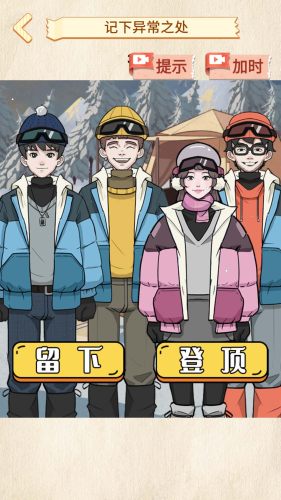 休闲的小游戏,伙伴一起在雪山合影。惊悚好玩火眼金睛找出疑似点,请找出照片疑似之处成功找出相关数量则游戏获胜。快来加入我们吧