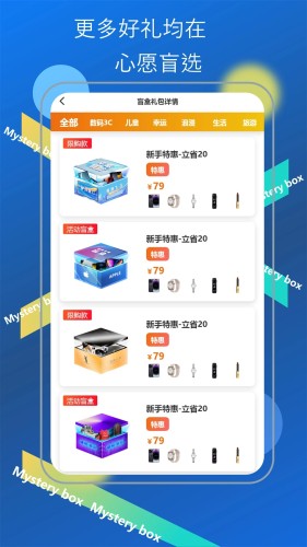 心愿盲选app是一款网购盲盒的app。以超值的价格,买到不知道的东西。全看运气,一种中奖的神奇感觉,为您的生活增添一点小小的期待和惊喜。而且在平台购买的盲盒物品,都是品质有保障的正品,质量有保证。